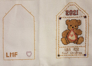 My current WIP is this ornament for my newest great-niece. I have had the teddy chart for over 20 years, and I know it was an internet freebie, possibly from DMC, though it is no longer on their website.